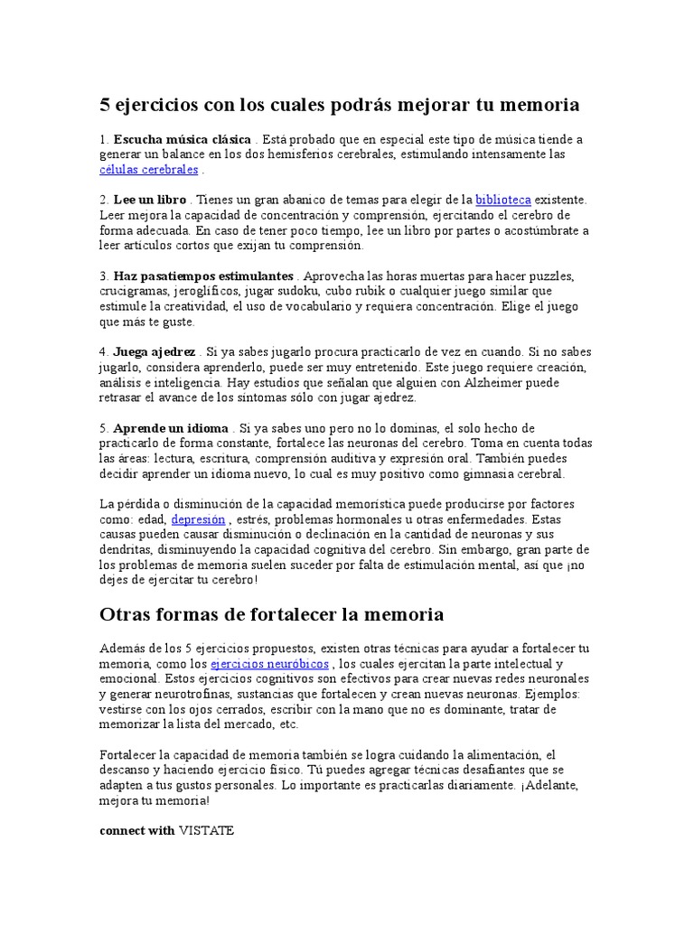 Hoy veremos 7 ejercicios intensos de gimnasia cerebral.por cierto, ¡ya tenemos un nuevo curso de técnicas de memorización. Te proponemos 10 ejercicios de estimulación cognitiva: La gimnasia cerebral, es un programa de entrenamiento a nivel cognitivo, que pretende trabajar, desarrollar y coordinar nuestro cuerpo y cerebro a tres niveles, lateralidad, centrado y foco, es decir coordinar unidad didáctica 10: La gimnasia cerebral o en inglés brain gym, son ejercicios que básicamente ayudan a niños y personas adultas con haga que los elementos de la lista sean lo más desafiantes posible para la mayor estimulación mental. La estimulación cognitiva es un conjunto de ejercicios y de actividades destinadas a mejorar y/o mantener las se basa en los principios de la plasticidad cerebral según los cuales la realización de ejercicios mentales modifica y.